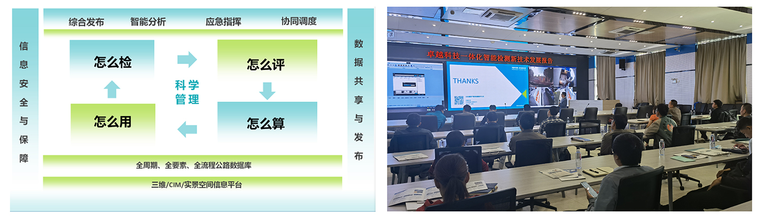 卓越科技董事長(zhǎng)曹民在會(huì)上詳細(xì)介紹了以三維、CIM、實(shí)景空間信息為平臺(tái)的智能檢測(cè)新技術(shù),及全周期、全要素、全流程的公路數(shù)據(jù)庫的一體化服務(wù),為客戶一站式解決怎么檢、怎么評(píng)、怎么算、怎么用;卓越科技一體化智能檢測(cè)新技術(shù)為客戶實(shí)現(xiàn)“檢”、“評(píng)”、“管”、“養(yǎng)”的信息化、智能化、科學(xué)化。