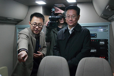 隨后楊松主席一行移步于生產(chǎn)車間。在曹民董事長的陪同下,楊松主席饒有興致地登上智能道路檢測系統(tǒng),了解和體驗這臺先進(jìn)的道路檢測設(shè)備的各項功能。(卓越科技智能道路檢測系統(tǒng)在正常行駛情況下,能自動完成道路病害、道路沿線設(shè)施、路面形狀、車轍、平整度、道路幾何線形等數(shù)據(jù)的采集,可為道路預(yù)防性養(yǎng)護(hù)提供有力數(shù)據(jù)支撐)。
